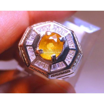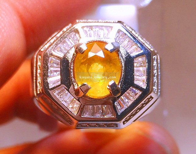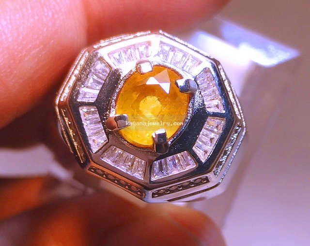 name : NATURAL YELLOW SAPPHIRE. measurements : 7,6 x 6,5 x 4,7 MM. weight : 1,82 carats. shape : oval. transparency : transparent. color : yellow clarity : lightly inclusion. cutting style : mixed cut. rings : rhodium silver + cubic zirconia. comments : nice design !!